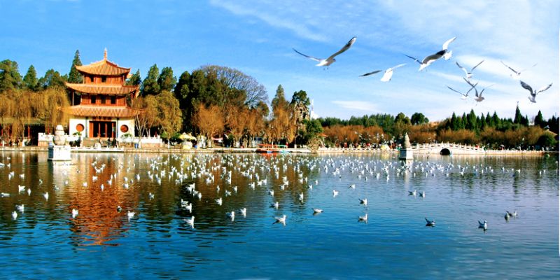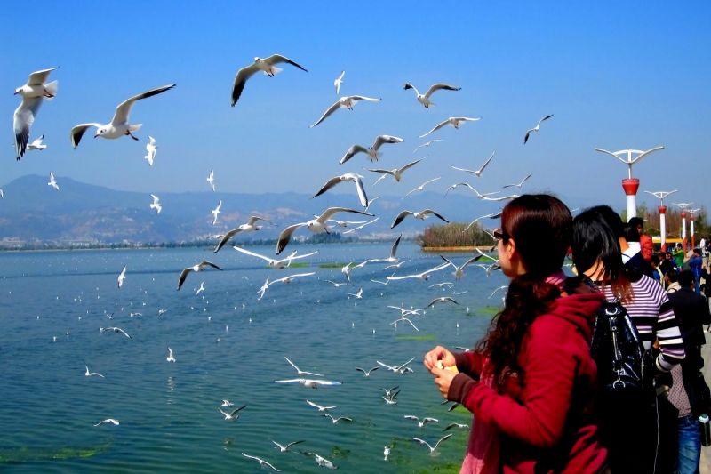 Hồ Điền Trì – hay còn gọi là hồ Côn Minh, hồ nước ngọt khổng lồ nằm trên độ cao 1.886,5m so với mực nước biển và là hồ nước tự nhiên lớn thứ 3 của Trung Quốc. Nằm trên cao nguyên Vân Nam, với mặt nước trong xanh, hồ Điền Trì được mệnh danh là “Viên Minh Châu toả sáng trên cao nguyên”. Hồ Điền Trì từ sau tháng 11 đến khoảng tháng 3 năm sau là thời điểm được coi là đẹp nhất với làm nước trong xanh, những hàng cây xung quanh đổi màu, rủ bóng kết hợp với cái se lạnh của mùa thu cũng sẽ làm xao xuyến bất kỳ du khách nào ghé nơi đây. Đặc biệt, khi cái lạnh tràn xuống từ phương bắc, vùng Siberi của Nga băng tuyết phủ trắng xoá, cũng là lúc từng đàn chim Hải Âu bắt đầu cuộc hành trình vạn dặm về khu vực hồ Điền Trì nằm sâu trong lục địa để tránh những cơn gió buốt lạnh. Khắp các dải núi xanh biếc, tô điểm màu trắng của loài Hải Âu. Những dây điện cao áp tít mít trời xanh, đàn Hải Âu xếp hàng đậu nhìn như những chuỗi hạt, Hải Âu bơi trên mặt hồ mênh mông, đậu trên những chiếc thuyền buồm, tranh giành cá với ngư dân, tạo nên một khung cảnh kỳ lạ. Cả đoạn đường dài khoảng 4km ngập tràn cánh chim trắng. Đây có lẽ là điều tuyệt diệu nhất thiên nhiên ban tặng cho Côn Minh để có thể biến nơi đây thành một điểm du lịch lý tưởng, một góc nhỏ khiến ai cũng nhớ