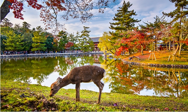 - Công viên Nara – nằm ở phía Nam cố đô Kyoto. Đây là một công viên yên bình, thanh tĩnh, không khí trong lành với rất nhiều cây xanh. Nằm ở vị trí trung tâm của thành phố Nara. Đây đồng thời cũng là công viên có diện tích lớn nhất Nhật Bản, với diện tích lên đến gần 700ha, trải rộng và được phủ bởi một lớp cỏ xanh mướt. Nơi này còn là nơi sinh sống, bảo tồn của hơn 1200 chú nai và hươu thuộc các giống loài khác nhau. Đừng quên lưu lại những bức ảnh lưu niệm với những chú nai thân thiện ở đây nhé. Xe và hướng dẫn đưa quý khách về lại Osaka, thỏa sức mua sắm tại trung tâm mua sắm nổi tiếng sầm uất Shinsai Bashi với vô vàn các sản phẩm nội địa Nhật Bản chất lượng cao.