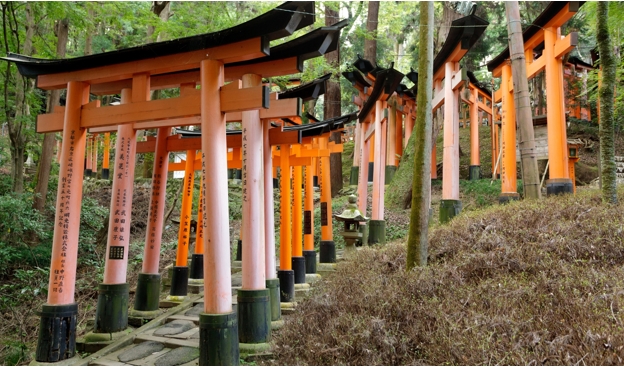 - Chùa nghìn cột Fushimi Inari - Ngôi đền thờ thần đạo nổi tiếng của Kyoto. Nơi đây nổi bật với hơn 1000 cổng Tori màu đỏ son, những chiếc cổng Tori này liên kết với nhau tạo thành những con đường mòn nằm phía sau khu đền chính. Những con đường này dẫn chúng ta đến với khu rừng rậm của ngọn núi Inari linh thiêng, ngọn núi cao 233 mét nằm trên đất của ngôi đền.